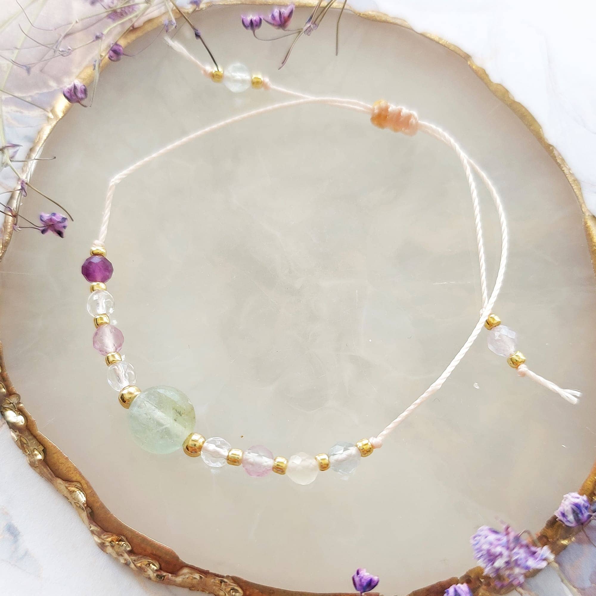 Bransoletka z fluorytu i kryształu górskiego, na beżowym sznurku ze złotymi przekładkami.