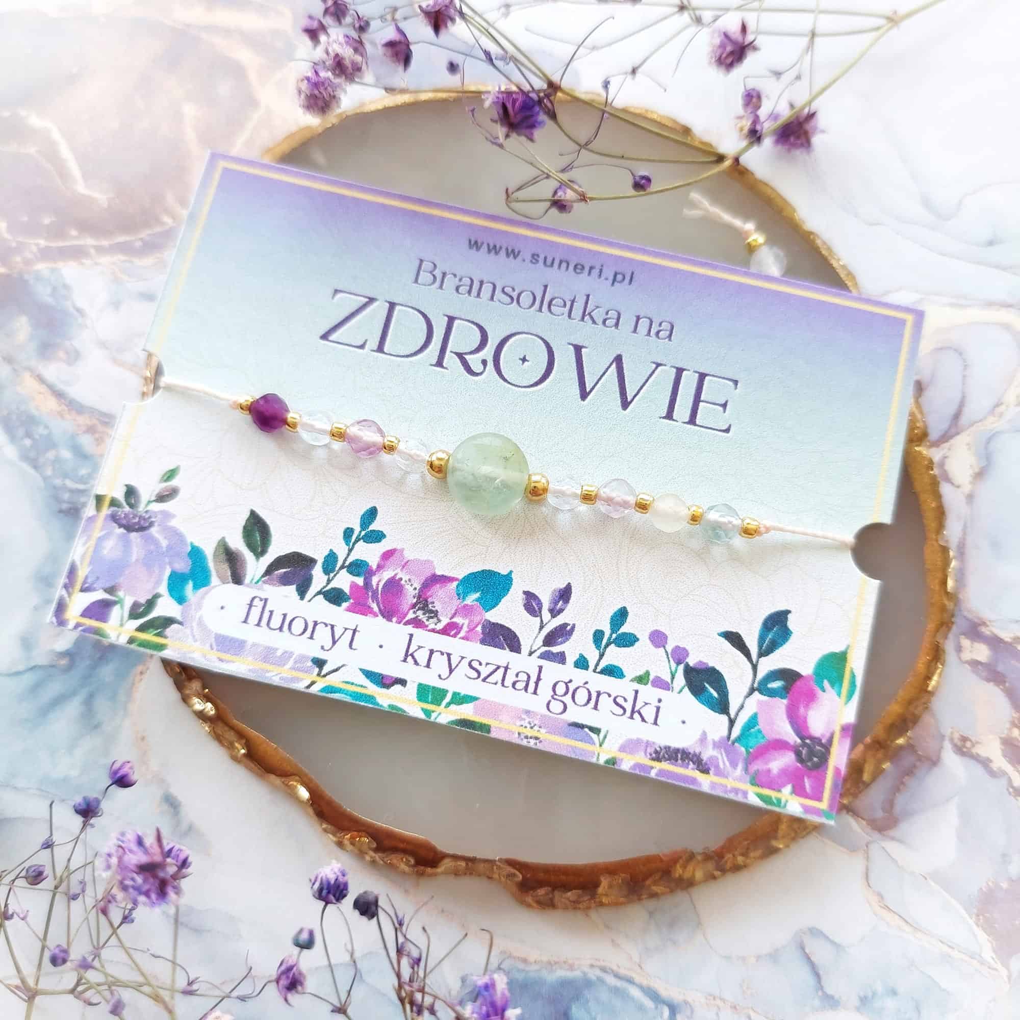 ✦ ZDROWIE ✦ fluoryt i kryształ górski bransoletka na sznurku złote przekładki