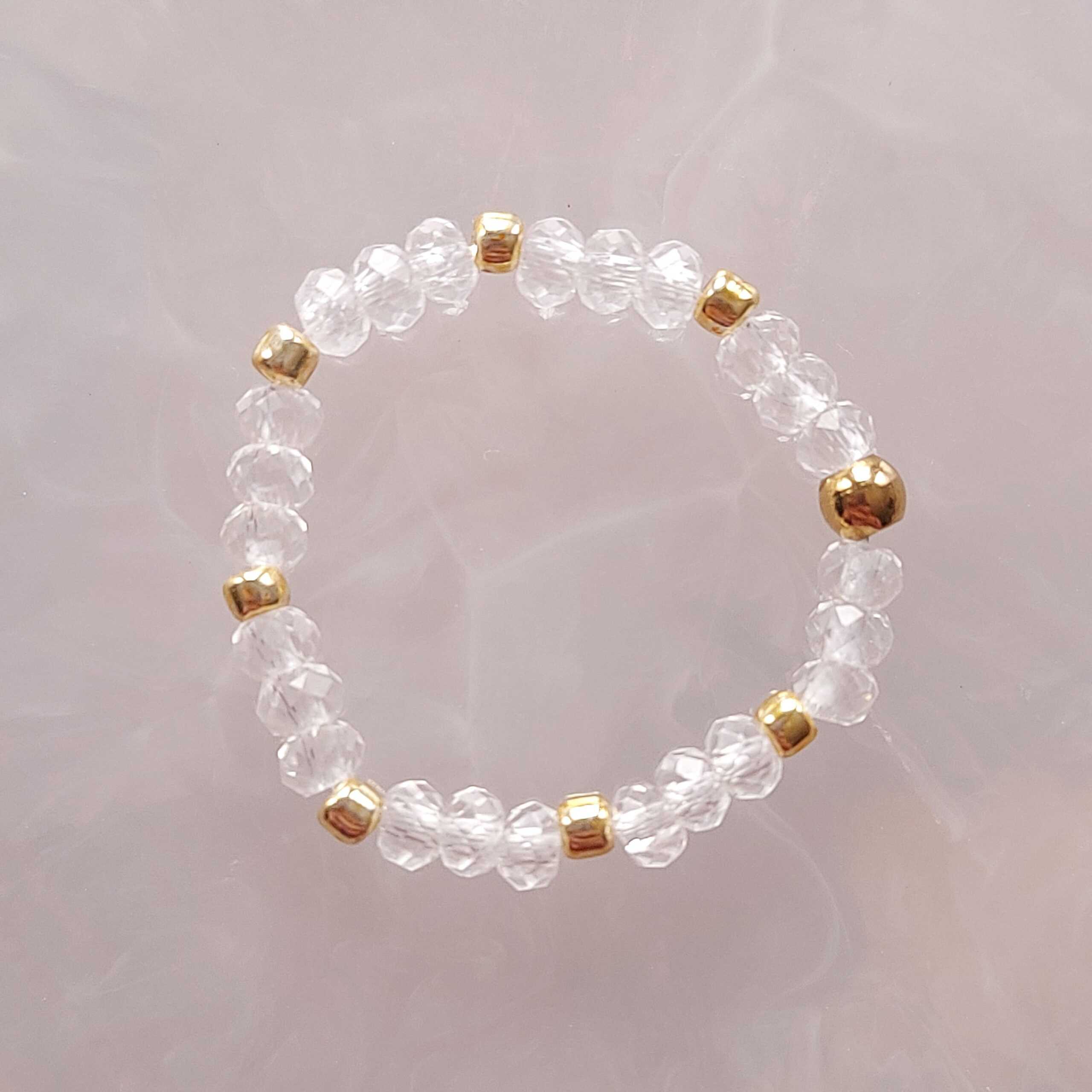 Pierścionek z kryształu górskiego z przekładkami ze stali szlachetnej w kolorze złotym.